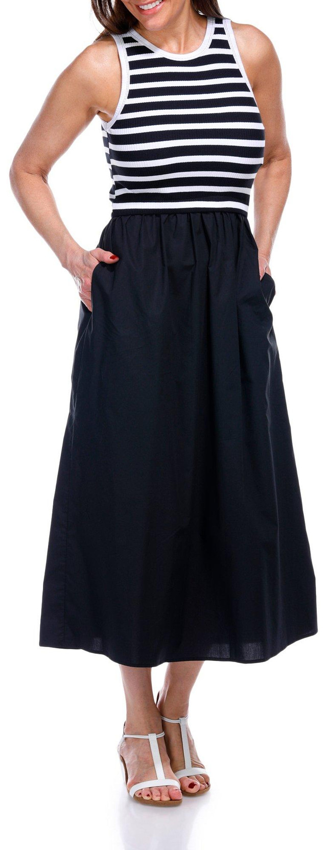 Step out in style with the Sleeveless Skirt Dress. Featuring a unique mixed media design with both striped and solid patterns, this dress offers a modern and chic look. The double side pockets add a practical touch, perfect for keeping essentials close at hand. Crafted from soft, breathable fabric, it ensures comfort throughout the day. Fabrication is 95% polyester, 5% elastane.