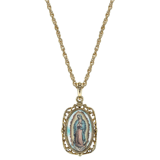 Our Lady of Guadalupe is also called Empress of the Americas. The pendant artwork features the manifestation of Mary in a traditional star embroidered in a blue gown. Her hands are clasped in prayer and beneath her feet rests an infant, representing Senora Nuestra de Guadalupe as the protector of the innocents. Length 24 in., width 25mm.