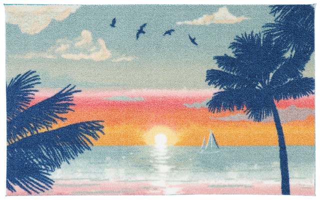 Introducing the Seaside Sunset Accent Rug, a vibrant addition to any room. This stunning rug features a colorful seaside sunset print that brings a touch of coastal charm to your home. Its non-skid backing ensures it stays securely in place, providing both beauty and safety. Measures 20 in x 32 in.