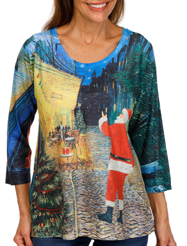 This womens 3/4 sleeve top features a crew neck and lightweight fabric. It showcases a festive Christmas scene of Santa, bringing holiday cheer and cozy style to seasonal celebrations.