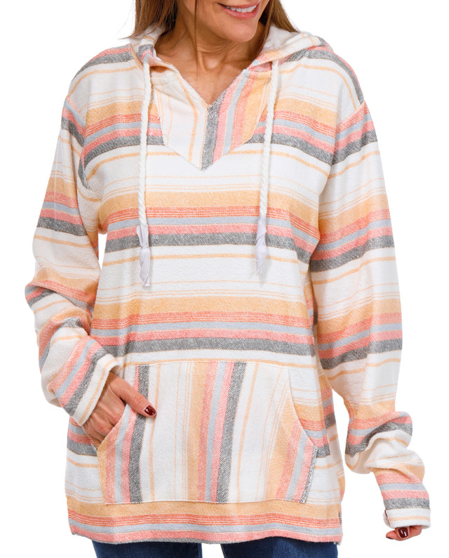 The Juniors Baja Strip Hoodie is a stylish and comfortable choice for any casual occasion. Made from a blend of cotton and polyester, this hoodie features a trendy striped print, a drawstring hooded neckline, and a practical kangaroo pocket. Perfect for layering or wearing on its own, this hoodie adds a touch of laid-back charm to your wardrobe.