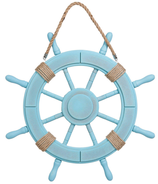 This Large Ships Wheel Wall Decor is a charming addition to any coastal decor. The design adds depth and texture to your walls and the wood and rope enhance its rustic appeal, making it a perfect fit for beach houses or nautical-inspired rooms. It is an eye-catching piece that adds a touch of the ocean to your home decor. Measuring approximately 24 in x 1 in.