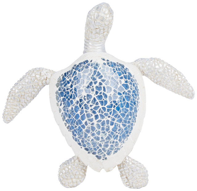 Bring a touch of the ocean to your home with our 6 in Resin Mosaic Sea Turtle Home Accent. This charming piece features a beautifully detailed sea turtle design, adorned with a vibrant mosaic pattern that adds a splash of color and elegance to any space. Perfect for display on shelves, mantels, or tables, it brings a whimsical and serene vibe to your decor. Measures approximately 6 in x 6.5 in x 1.5 in.