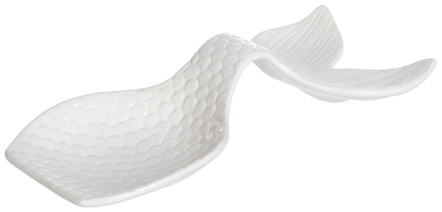This large ceramic spoon rest is shaped like a mermaid tail and finished in white. It adds a whimsical and functional touch to your kitchen while keeping countertops clean during cooking. Measures approximately 11 in x 4.5 in x 2 in.
