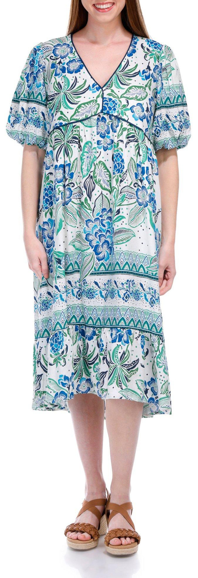Introducing the Women's Short Sleeve Floral Midi Dress, crafted from a blend of linen and rayon. This elegant dress features a vibrant floral print, a flattering v-neckline, and short puffer sleeves. With a waist tie and a 41-inch length, it offers both style and comfort. Perfect for any occasion, this dress combines beauty and ease, making it a delightful addition to your wardrobe.