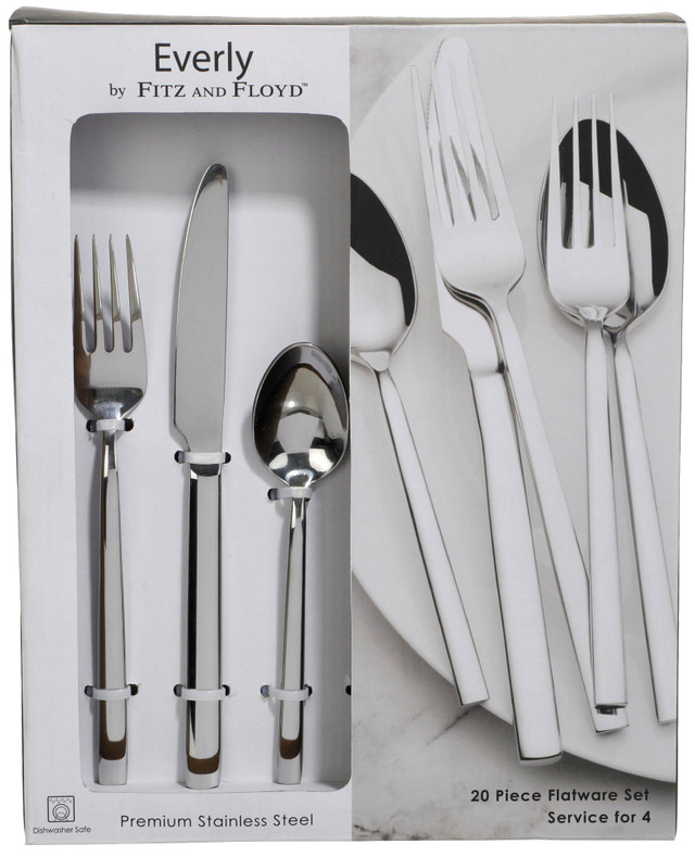 This stylish set features thin handles with distinct bands at the neck and tip of the handles, and a smooth finish that complements the shine of the heads of each piece. This set adds a touch of elegance to everyday dining and casual gatherings. Set includes 4 of each: 4each of: salad fork, dinner fork, dinner knife, dinner spoon, and teaspoon. Crafted of 18/0. Dishwasher safe.