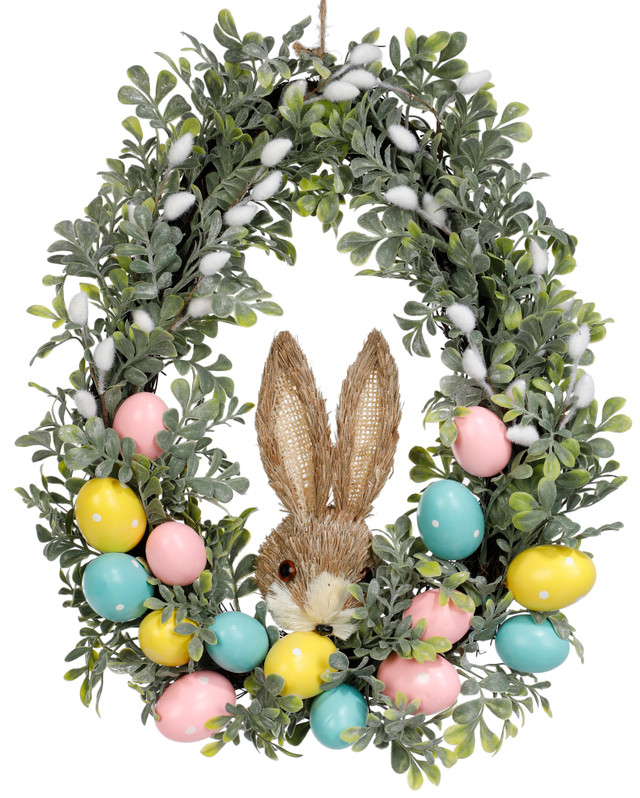 This Easter egg shaped wreath features lush greenery accented with colorful eggs for a bright seasonal look. A sweet bunny head at the center adds a playful focal point, making it a charming decoration for doors, walls, or spring and Easter displays. Measures approximately 17 in x 14 in at widest point.