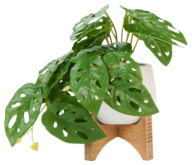 Add a natural touch to your décor with the 5.5-inch Trailing Leaf in Ceramic Pot with Wood Stand. Measuring approximately 5.5 in x 4 in x 6 in, this stylish accent features a sleek ceramic pot paired with a sturdy wooden stand for a modern look. Perfect for desks, shelves, or tabletops, it brings greenery and elegance to any space.