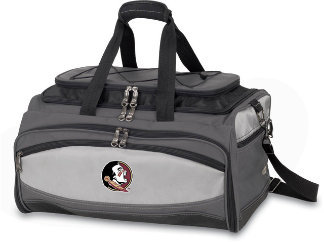 The ultimate tailgating set! Cooler measures 16'' x 8'' x 7'' and holds 24 cans. Tote includes: portable charcoal grill with lid (16.7'' x 10.8'' x 5.1''), drawstring bag, spatula featuring bottle opener, grill scraper, and serrated edge, tongs, and BBQ fork.