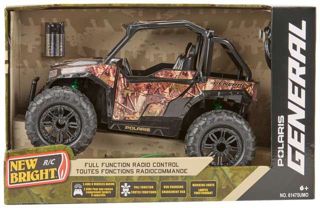 Take the wheel of a Polaris® legend with the 1:14 scale General RC Off-Road Vehicle. This officially licensed RC model features authentic design details and high-performance handling for off-road fun at home. The vehicle is powered by a built-in USB rechargeable battery and includes a 2.4GHz remote for long-range, interference-free control. Rugged tires and a front suspension system help it tackle bumps and indoor terrain with ease. Ages 6+