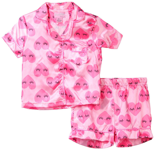 This big girls two-piece pajama set combines style and comfort with a button-down collared shirt and matching shorts. The soft pink fabric features a charming heart with lashes pattern for a fun bedtime look. Made with flame-resistant material, it ensures safety while keeping her cozy all night.