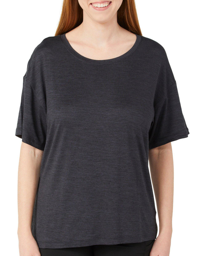 Stay cool and focused in this womens active performance tee. Featuring a heathered exterior, short sleeves and a classic crew neckline, it is enhanced with om dri moisture management tech to keep you dry and comfortable through every workout or casual day. Fabrication 94% polyester, 6% spandex.