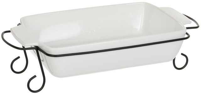 Enhance your baking experience with this 2 Pc Stoneware Bakeware Set. The set includes a durable stoneware dish, measuring 15.5 inches in length, and a sturdy metal holding rack. Perfect for baking and serving, the stoneware dish ensures even heat distribution for perfectly cooked meals, while the metal rack provides easy handling and a stylish presentation. Ideal for any kitchen, this bakeware set combines functionality and elegance, making it a must-have for your culinary creations.