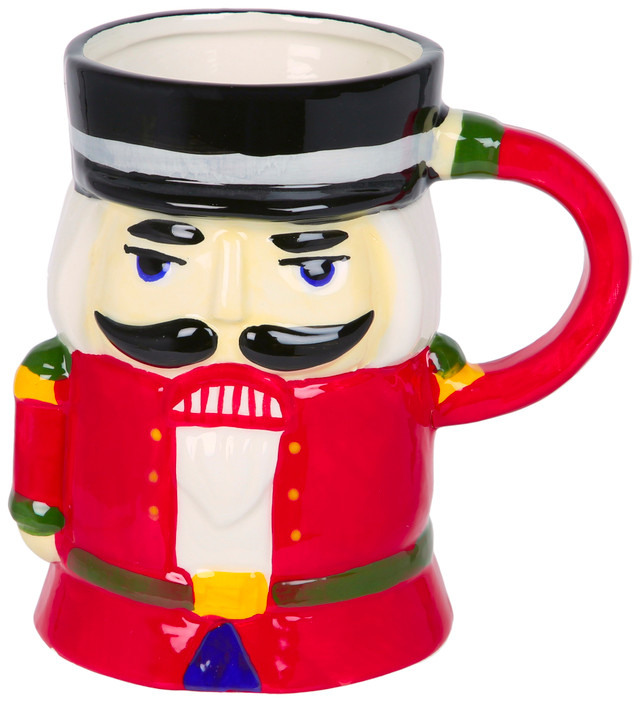 Celebrate classic holiday tradition with the 18 oz Christmas Figural Nutcracker Coffee Mug shaped like a festive nutcracker with detailed features and bold seasonal colors. A charming addition to Christmas drinkware collections. Hand wash only. Fabrication is 100% ceramic. Measures approximately 5.75 in x 3.5 in diameter. Holds 18 oz.