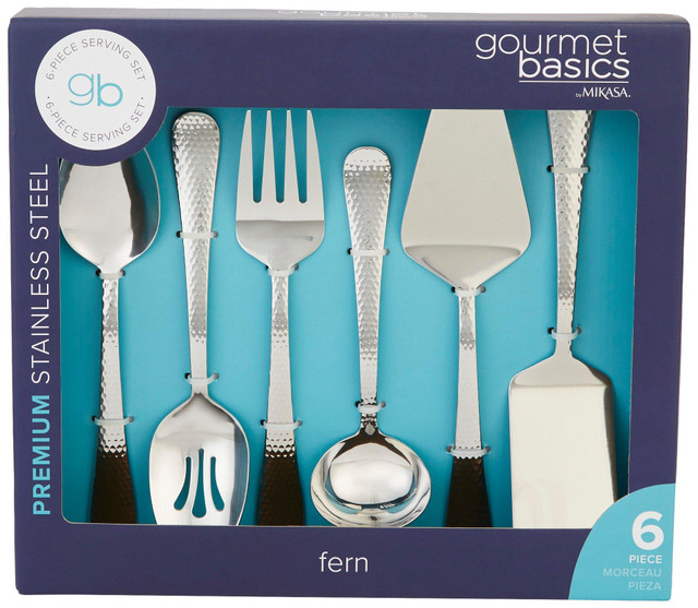 Serve in style with this elegant fern-themed set crafted from premium stainless steel. It includes 1 serving spoon, 1 slotted serving spoon, 1 gravy ladle, 1 serving fork, 1 pie server, and 1 flat server. Each piece is dishwasher safe for easy cleanup and designed for durability and everyday use. Perfect for entertaining or adding a refined touch to your table.