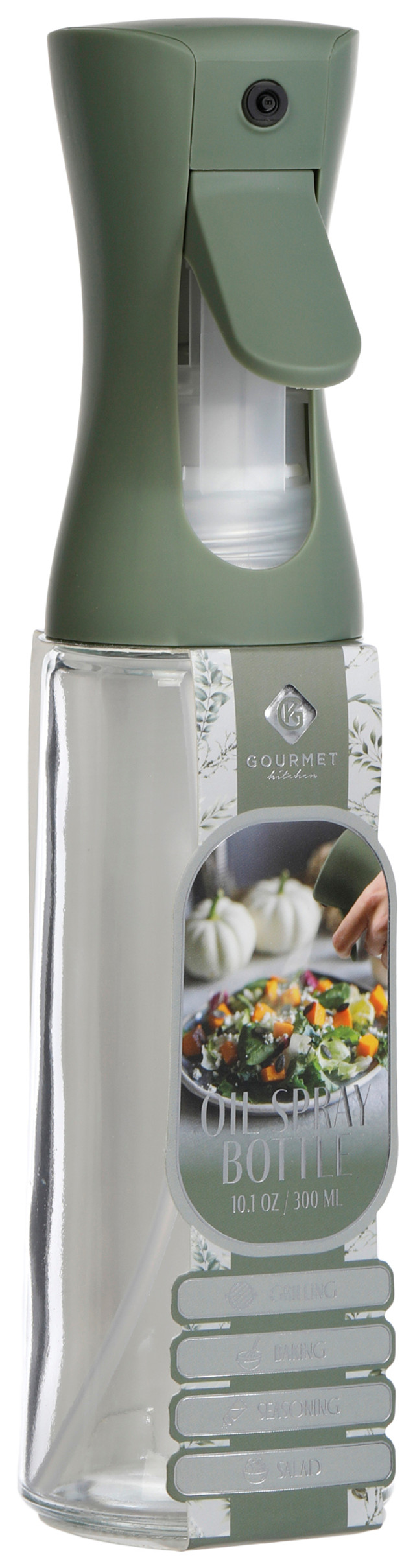This glass olive oil spray bottle is perfect for grilling, baking, and seasoning. It features a wide opening for easy refilling and a strong press button for precise, effortless spraying. Measures approximately 9.75 in x 2.5 in.