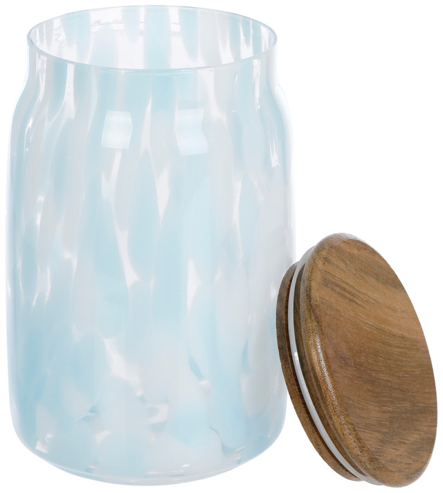 This decorative glass jar is designed for kitchen use and features a blue painted finish with a biodegradable acacia wood lid. Crafted from Murano glass, it combines elegance and functionality while adding a stylish touch to your kitchen. Measures approximately 6.75 in x 4.25 in.