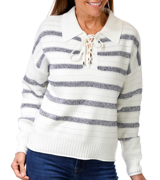 This Womens Lace Up Stripe Sweater brings elevated comfort to everyday style. Featuring a modern stripe design with a chic lace up neckline, this sweater offers a relaxed fit and soft feel for all day wear. Perfect for layering or standalone looks, it delivers effortless style with a cozy, fashion forward edge. Fabrication is 51% cotton. 34% acrylic, 15% polyester.