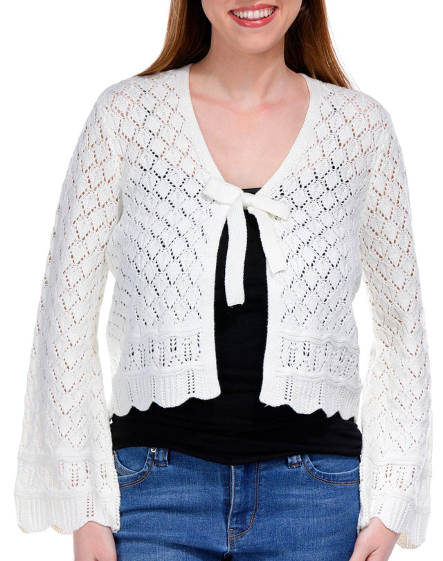 Add a touch of bohemian charm to your wardrobe with this Long Sleeve Crochet Cardigan. Featuring a delicate crochet design and a stylish tied front, this cardigan is perfect for layering over your favorite outfits. The long sleeves provide warmth and elegance, making it ideal for cooler days. Versatile and chic, this cardigan is a must-have addition to any fashion-forward wardrobe, combining comfort and style effortlessly. Fabrication is 51% cotton, 49% acrylic.