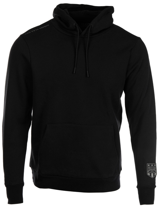 This mens long sleeve hoodie is made from a soft cotton blend that provides comfortable warmth and everyday wearability. The solid design features an adjustable drawstring hood, a classic kangaroo pocket, and small text on the shoulder for a subtle modern detail. Length measures approximately 27 in. Fabrication is 64% cotton and 36% polyester.
