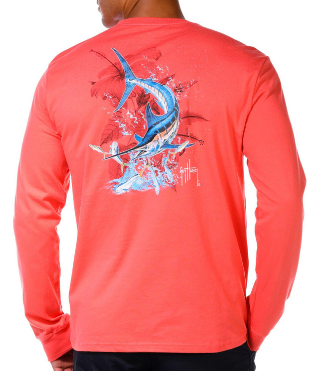 Show off your love for sport fishing from Guy Harvey featuring his award-winning marine artwork on this coastal long sleeve tee. This long sleeve top features a solid color design on lightweight knit fabric, a an eye-catching graphic on the back, a logo on the chest, and a crew neckline, and a regular fit. Fabrication 60% upcycled cotton 40% recycled polyester.