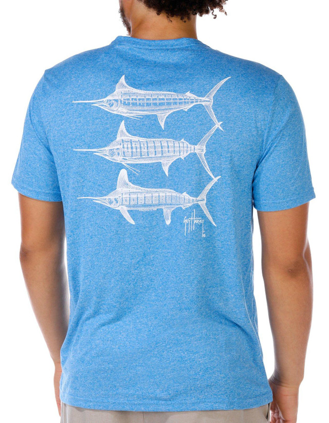Display award-winning marine artwork on this stylish coastal short sleeve tee. This short sleeve tee features a lightweight breathable fabric, an original brand Guy Harvey performance saltwater gear and graphic design on the back, Guy Harvey brand logo on the chest, tag less for comfort, and a flexible crew neckline.