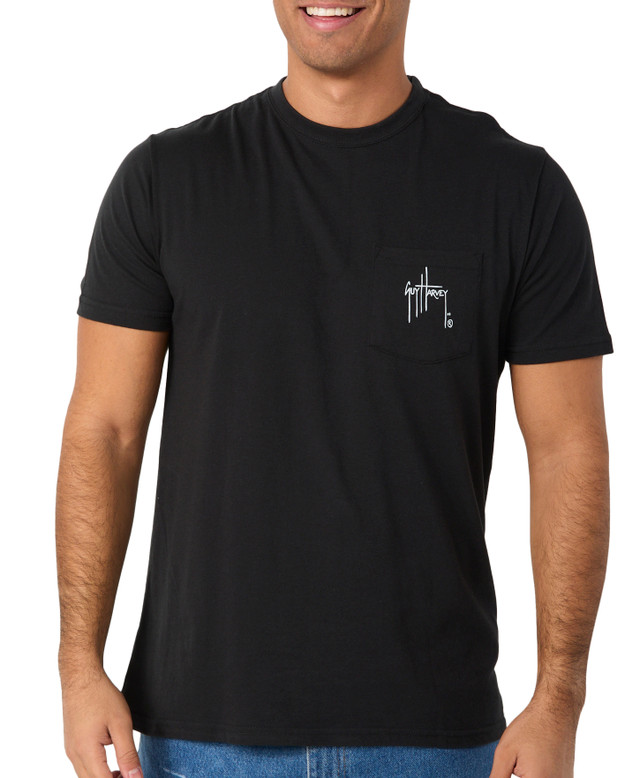 This mens short sleeve tee shirt features a solid color design with a classic crew neck and a convenient chest pocket. A tonal USA flag on the back adds a subtle patriotic detail, making it a versatile and stylish choice for everyday casual wear. Fabrication is 60% cotton and 40% polyester. Shirt length measures approximately 28 in long.