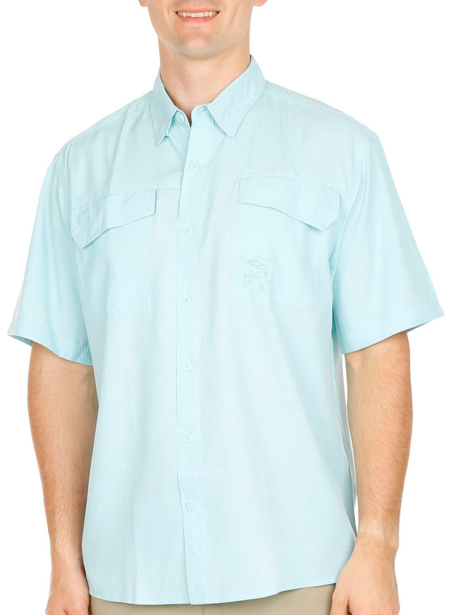Guy Harvey features his award-winning marine artwork on this coastal short sleeve shirt. It features a solid color design on lightweight woven fabric, a point collar, full button front closure, two chest flap adhesive closure pockets, a fully vented back panel to keep you cool, sun protection, moisture-wicking and quick-dry technology.