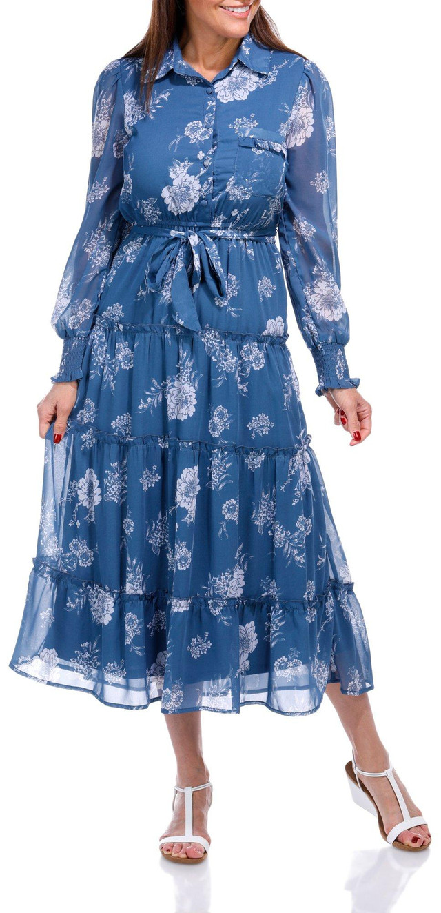 Introducing our Women's Long Sleeve Floral Chiffon Midi Dress, crafted from 100% polyester for a lightweight and airy feel. This elegant dress features a beautiful floral print, a collared neckline, and long sleeves. With a chest slip pocket, button-down front, and a tiered skirt, it offers both style and functionality. At 45 inches in length, it's perfect for any occasion, combining sophistication and comfort in one stunning piece.