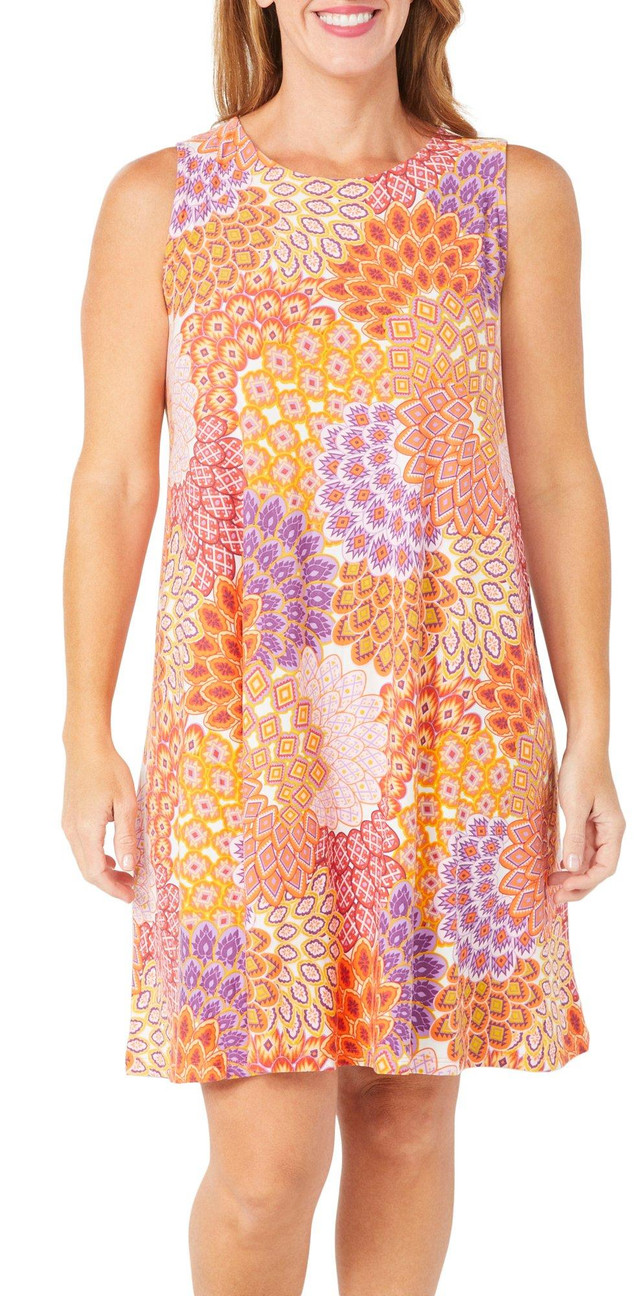 The Women's Sleeveless Swing Dress combines comfort and style with its flowy silhouette and tropical print. Designed to flatter every body type, this dress offers a relaxed fit and soft fabric that moves with you. Perfect for warm weather, it is ideal for casual outings or dressing up for special occasions. Fabrication is 92% polyester, 8% spandex