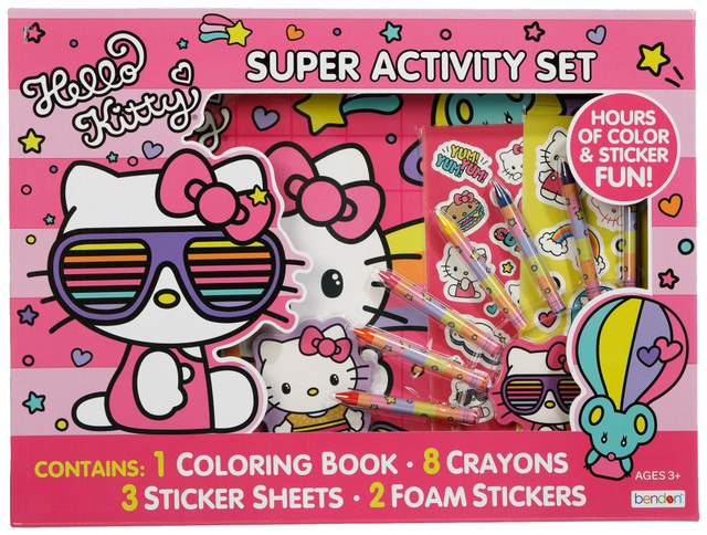 Fuel artistic expression with the Girls Hello Kitty Super Activity Set packed with engaging materials for endless creativity. Includes a coloring book, eight crayons, three sticker sheets, and two foam stickers that inspire imaginative play at home or on the go. Perfect for travel, rainy days, or as a thoughtful gift for young artists. Suitable for ages 3 years and up.