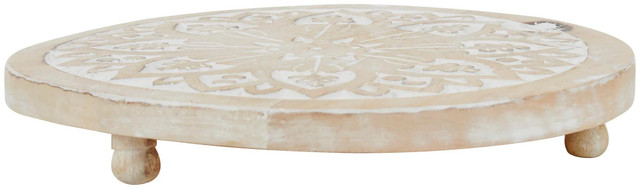 Protect your surfaces in style with this beautifully carved wood trivet. Measuring 9 inches across, it offers a sturdy and decorative way to hold hot pots and dishes. Made from quality wood material and easy to maintain, simply wipe clean with a damp cloth. A functional accent for any kitchen or dining space.