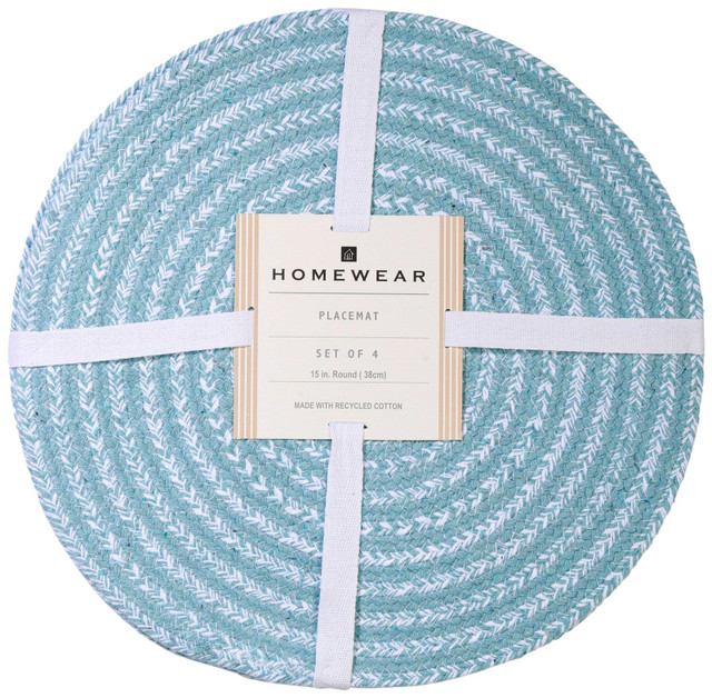 Add style to your table with a 4-pack of round placemats featuring a classic woven design. Crafted from 100% recycled cotton, they combine sustainability with everyday function. Ideal for casual meals or relaxed entertaining, these placemats are easy to clean and made to last. Fabrication is 100% recycled cotton. Measures 15 in round.