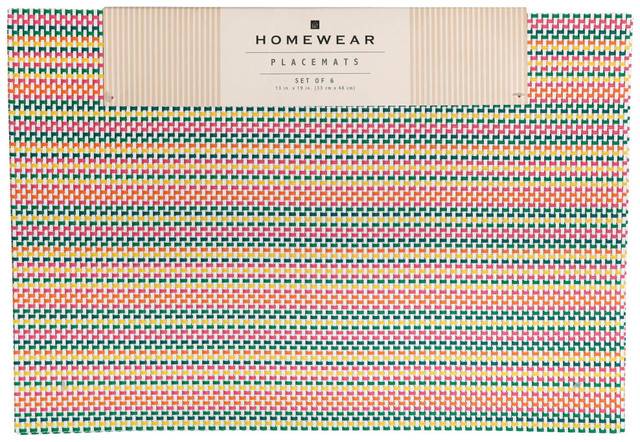 Add modern style to your table with a 6-pack of rectangular placemats featuring a classic striped pattern. Made from a durable PVC and polyester blend, they offer both function and design. Perfect for everyday dining or casual entertaining, these placemats are easy to clean and built to last. Fabrication is 70% PVC, 30% polyester. Measures 13 in x 19 in.