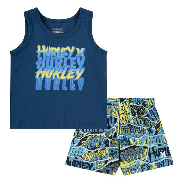 This baby boys' 2-piece set includes a tank top with bold brand script and a ripped sticker-style graphic, paired with printed shorts. Lightweight and playful, it is a fun outfit for warm-weather outings.