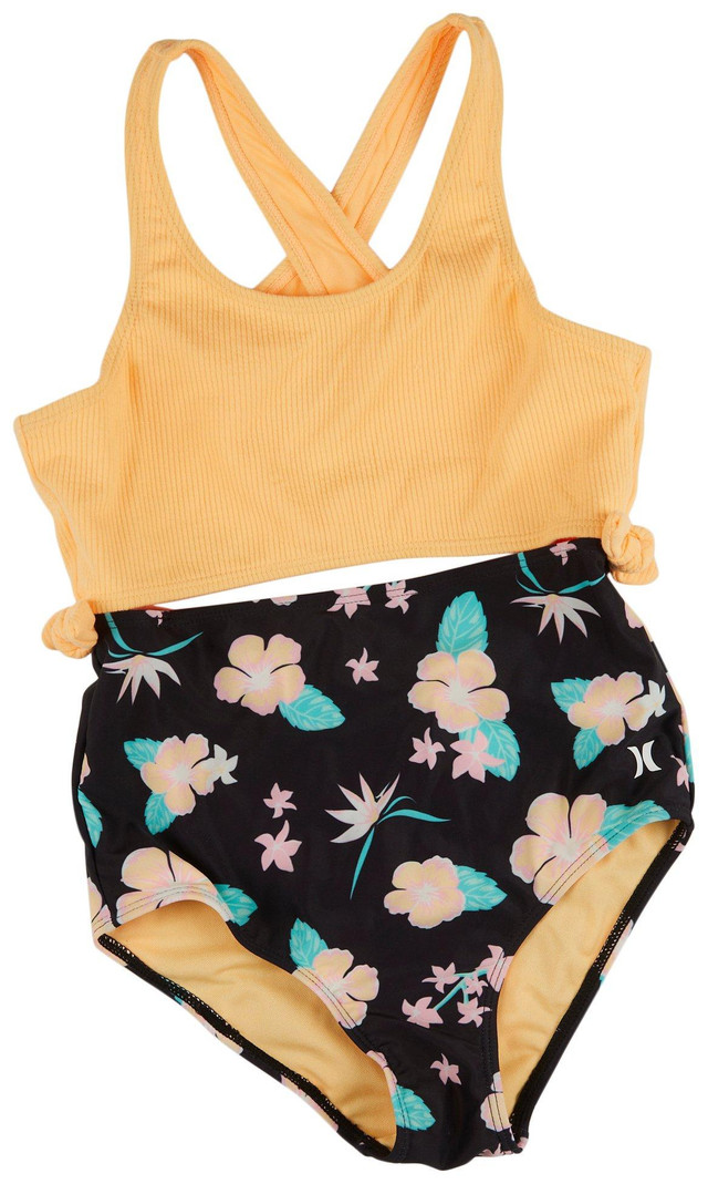 Introducing the Big Girls One Piece Crossback Floral Swimsuit, crafted from a blend of polyester and elastane for a comfortable and flexible fit. This stylish swimsuit features a unique crossback design, side cutouts for added flair, a solid ribbed upper, and a vibrant floral print bottom. Perfect for poolside fun or beach adventures, this swimsuit is a must-have for any young fashionista's summer wardrobe!