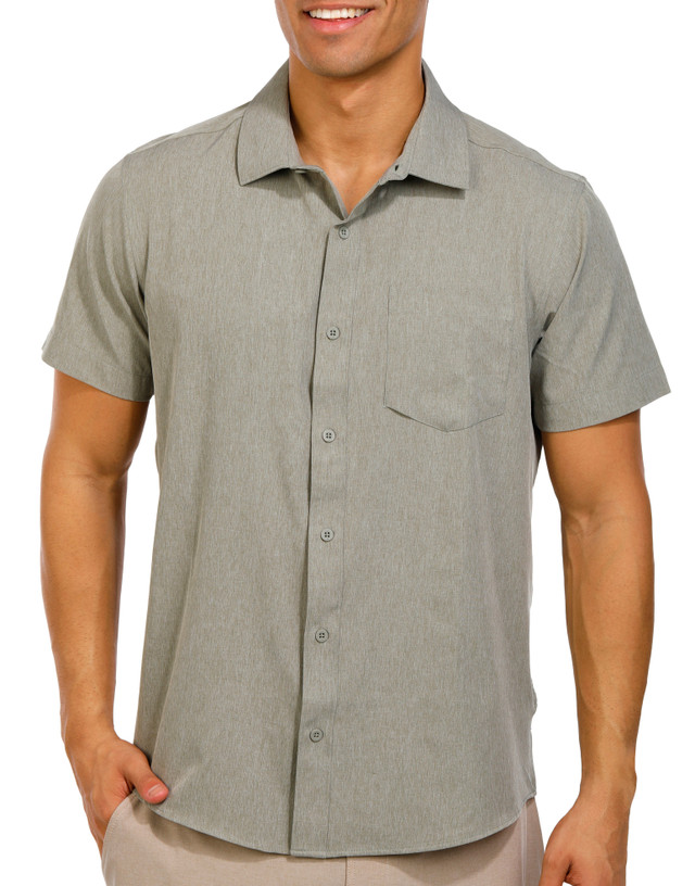Elevate everyday style with this mens shirt in a sleek solid color. The button front and classic collar offer a polished look while short sleeves and a chest pocket add practical comfort. Lightweight chambray fabric brings a modern touch to warm weather dressing. Fabrication 92% polyester, 8% spandex