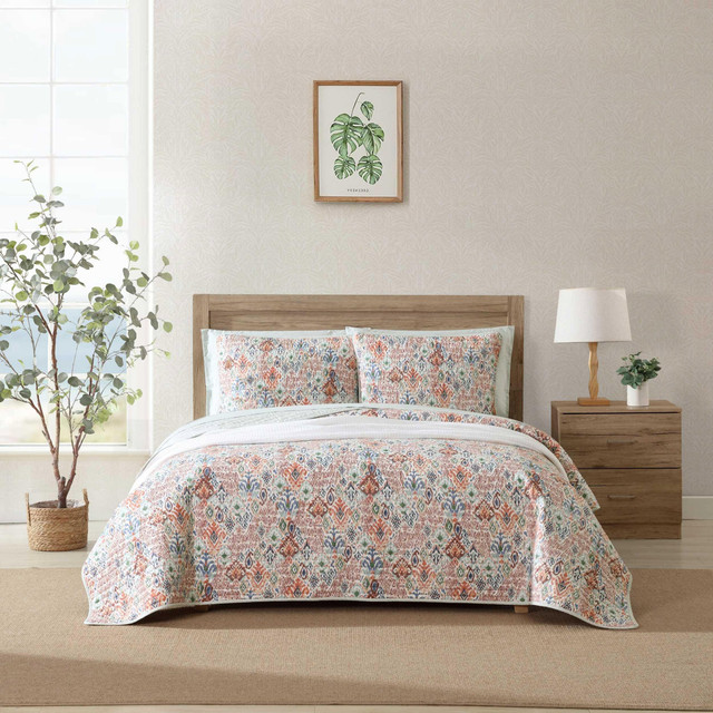 Add a breathable, fresh layer to your bedding ensemble with the tropical inspired Ikat Tropics Reversible Quilt Set from Tommy Bahama. The print combines a vibrant essence of color with the serene and calming elements of coastal living. The quilt is fully reversible, 100% cotton, lightweight and easy to layer. Machine washable for easy care.