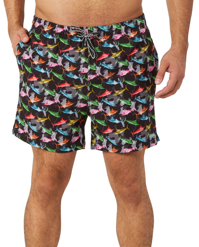 These mens swim trunks feature an elastic waist with drawstring for a secure fit and a fish pattern for a playful look. Fully lined with side seam pockets, they offer comfort and practicality, making them perfect for swimming, beach days, or water activities. Inseam is approximately 5 in. Fabrication is 93% polyester and 7% spandex.