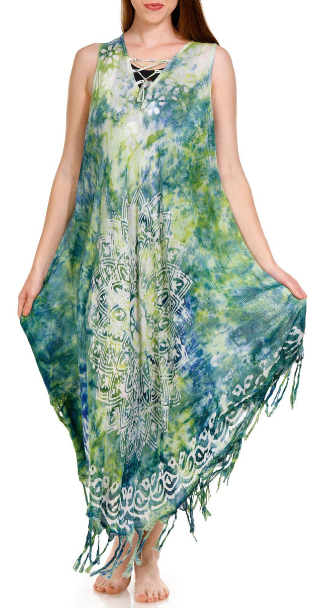 Make a statement with this Sleeveless Lace Up Umbrella Coverup Dress. This eye-catching coverup features a vibrant tie-dye print and a stylish lace-up neckline, adding a touch of bohemian flair to your beachwear. The flowing umbrella silhouette ensures a comfortable and breezy fit, while the tassel fringe adds a playful and chic detail. Perfect for sunny days by the water, this coverup dress combines style and comfort effortlessly.