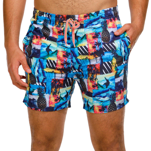 These 4-way stretch shorts with a full boxer lining inside feature an extra measure of comfort to wear practically every day. Fun prints. These shorts are quick-drying and breathable. The side pockets have zipper pulls that easily hide under a pocket flap. Front closure with a cord tie with rubber tip ends. Color fast, practical and comfortable.
