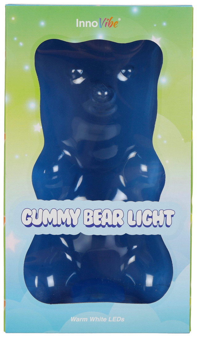 This adorable Gummy Bear Light is designed to bring a warm and cozy glow to your space making it the perfect addition to any bedroom, bookshelf, and living area. Enjoy warm white LED light over the transparent blue that creates a dream-like ambience. Requires 3 AAA Batteries (Not Included).