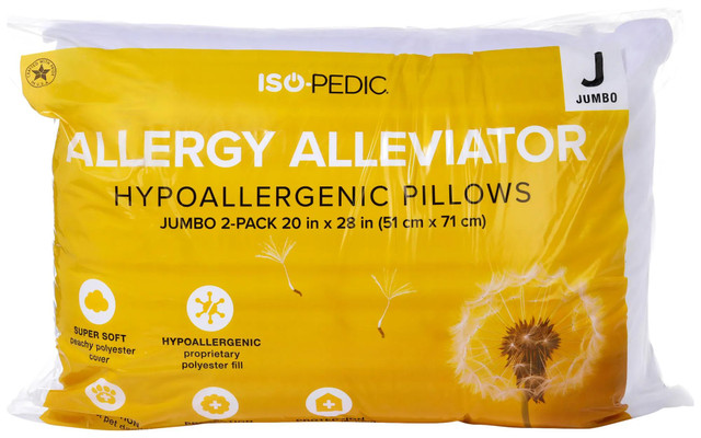 This 2 pack of pillows is super soft and hypoallergenic, designed to alleviate allergies while providing comfort and support for a restful night's sleep. Fabrication is 100% polyester. Each pillow measures 20 in x 28 in.