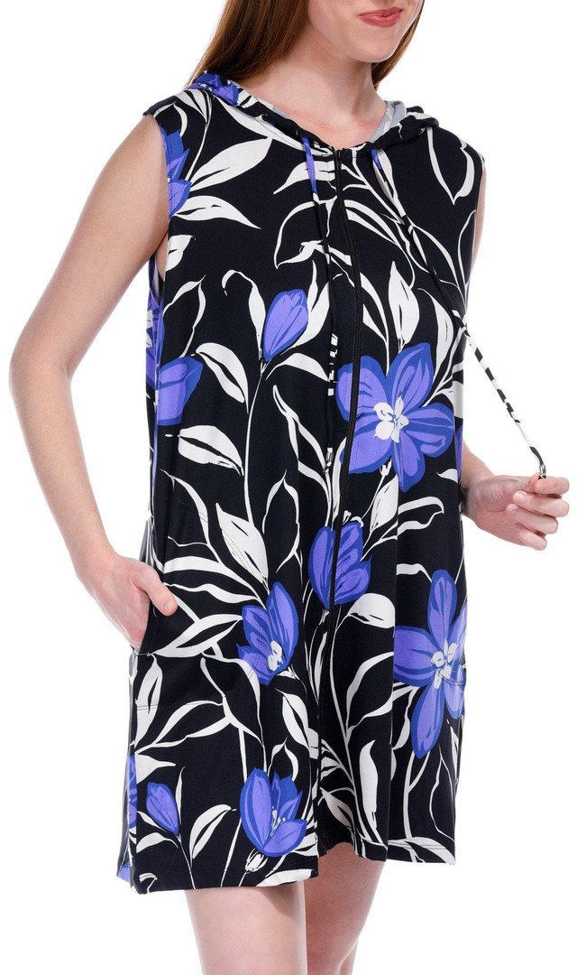 Stay stylish and cozy with this Women's Palmetto Full Zip Hoodie Cover-Up. Made from a soft, lightweight fabric, this hoodie features a full zip closure, a relaxed fit, and a hood for ultimate comfort. Perfect for those cooler beach days or evening walks by the shore, it offers a laid-back yet chic look that pairs beautifully with your swimsuit or casual wear. The tropical-inspired design adds a fun, fresh touch to your warm-weather wardrobe.