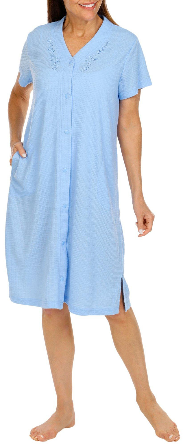 Experience ultimate comfort and style with our Women's 42-inch Snap Button Short Sleeve Robe. Crafted from 100% polyester, this robe features a luxurious waffle knit fabrication that feels soft against your skin. The full front snap button closure ensures easy wear, while the embroidered floral design on the collar adds a touch of elegance.