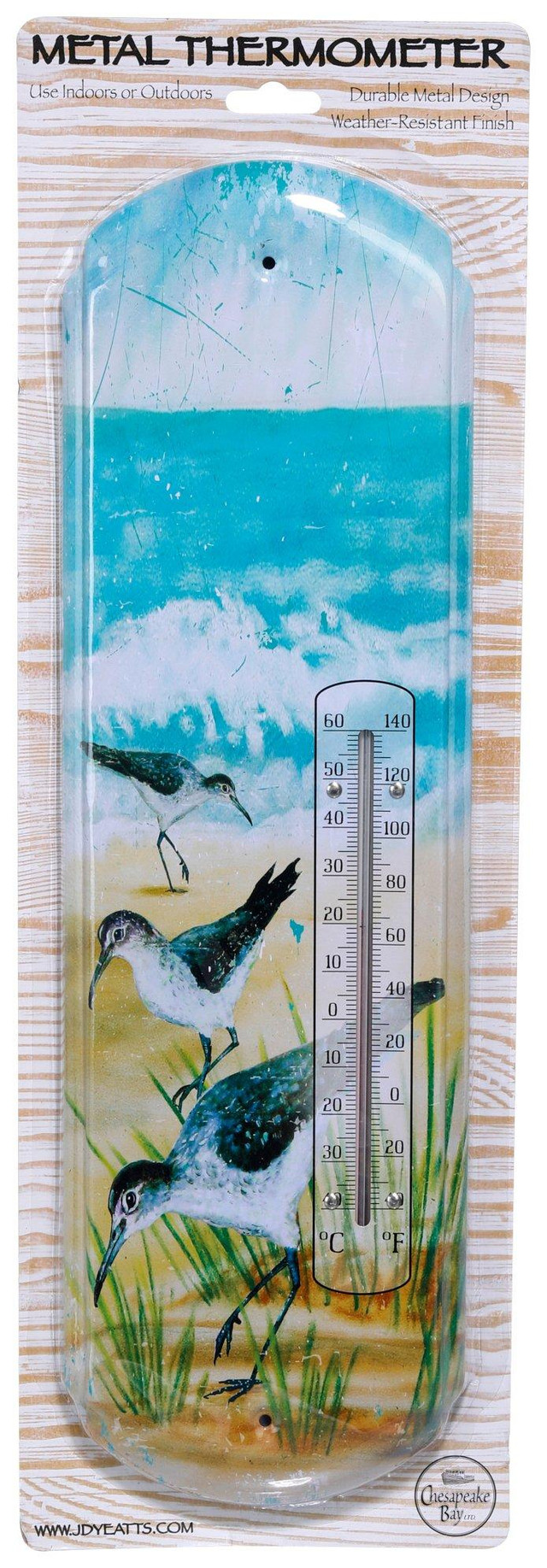 Introducing the Outdoor Sand Piper Thermometer, featuring a durable metal design and weather-resistant finish. Perfect for adding a touch of coastal charm to your outdoor space while reliably measuring the temperature. Ideal for beach lovers and garden enthusiasts! Measures 17.5 in x 5 in