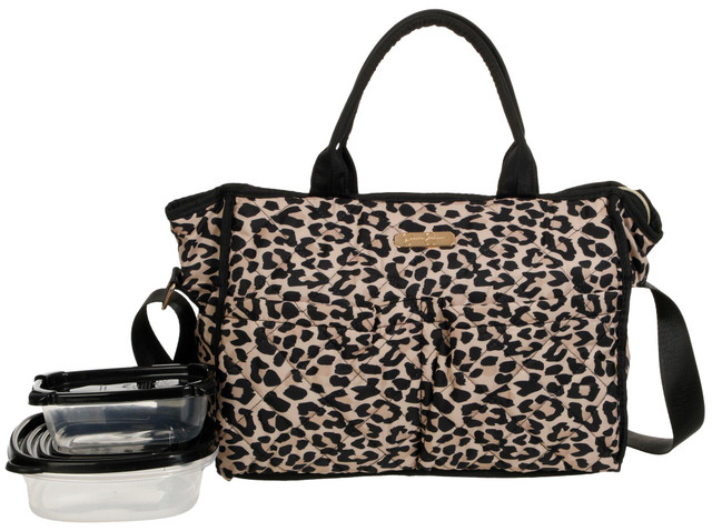 Carry your meals in style with this chic Cheetah Print Lunch Tote Bag. Featuring top handles and an adjustable strap, it offers versatile carrying options. The top zip compartment includes two plastic storage containers, keeping your food organized and fresh. Gold tone hardware adds a touch of elegance, while two exterior slip pockets provide extra storage for essentials. Perfect for work, school, or on-the-go, this lunch tote combines fashion and functionality effortlessly.