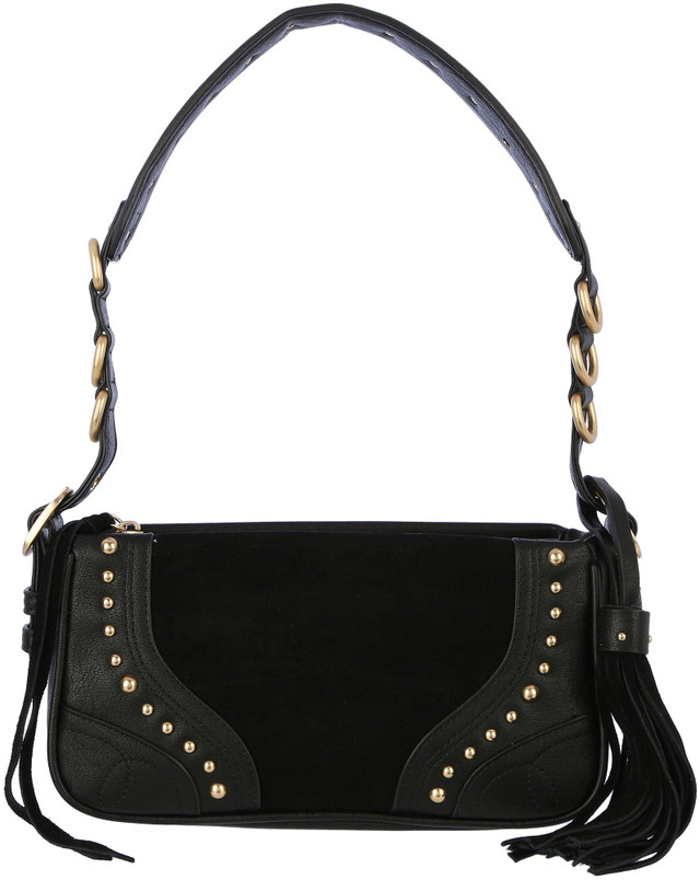 This crossbody bag features a stylish mix of faux leather and leather exterior, tassle accent, gold tone hardware, an adjustable crossbody strap, and one top zip compartment with zip pocket. Measures 10 in. x 2.5 in. x 5.5 in.