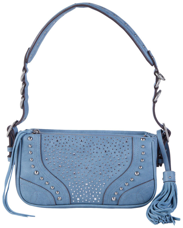 The Ellie Shoulder Bag exudes glamour and sophistication with its dazzling rhinestone embellishments and intricate embroidered details. Designed for both style and practicality, it features a secure zipped main compartment to keep your belongings safe. Measures approximately 10 in x 6 in x 3 in.