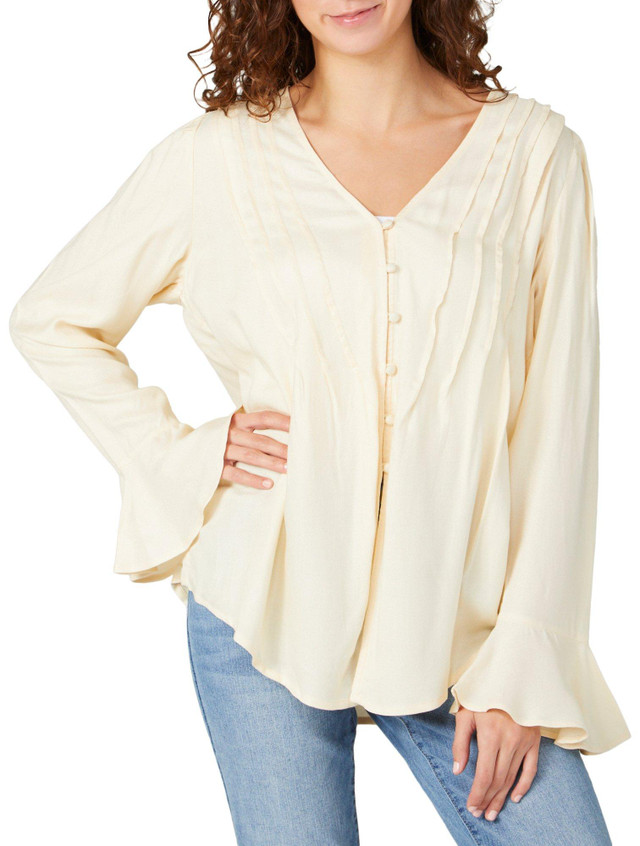 Introducing the Juniors Cecily Button Down Top, crafted from 100% viscose for a lightweight and flowy feel. This stylish top features a solid color design, pleated detail, and a button-down front, adding a touch of elegance to your wardrobe. The long sleeves and v-neckline offer a classic and versatile look, perfect for any occasion.